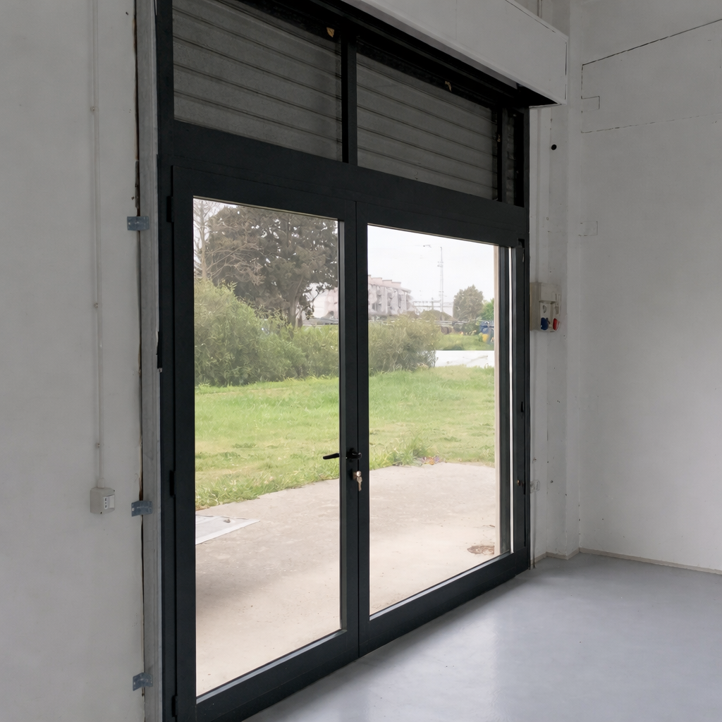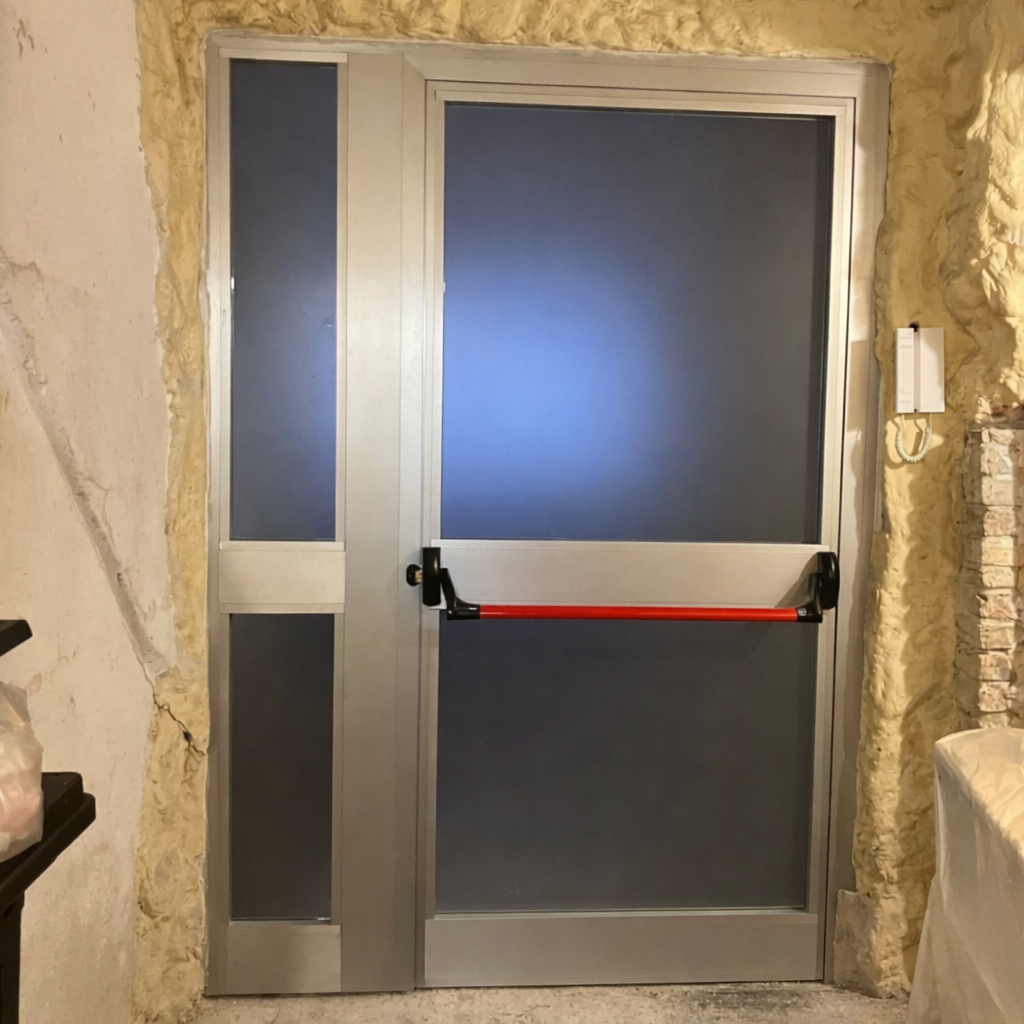 17. Porta a due ante asimmetrica, con apertura antipanico esterna. Colorazione Grigio Argento. Vetro Antifortunistico