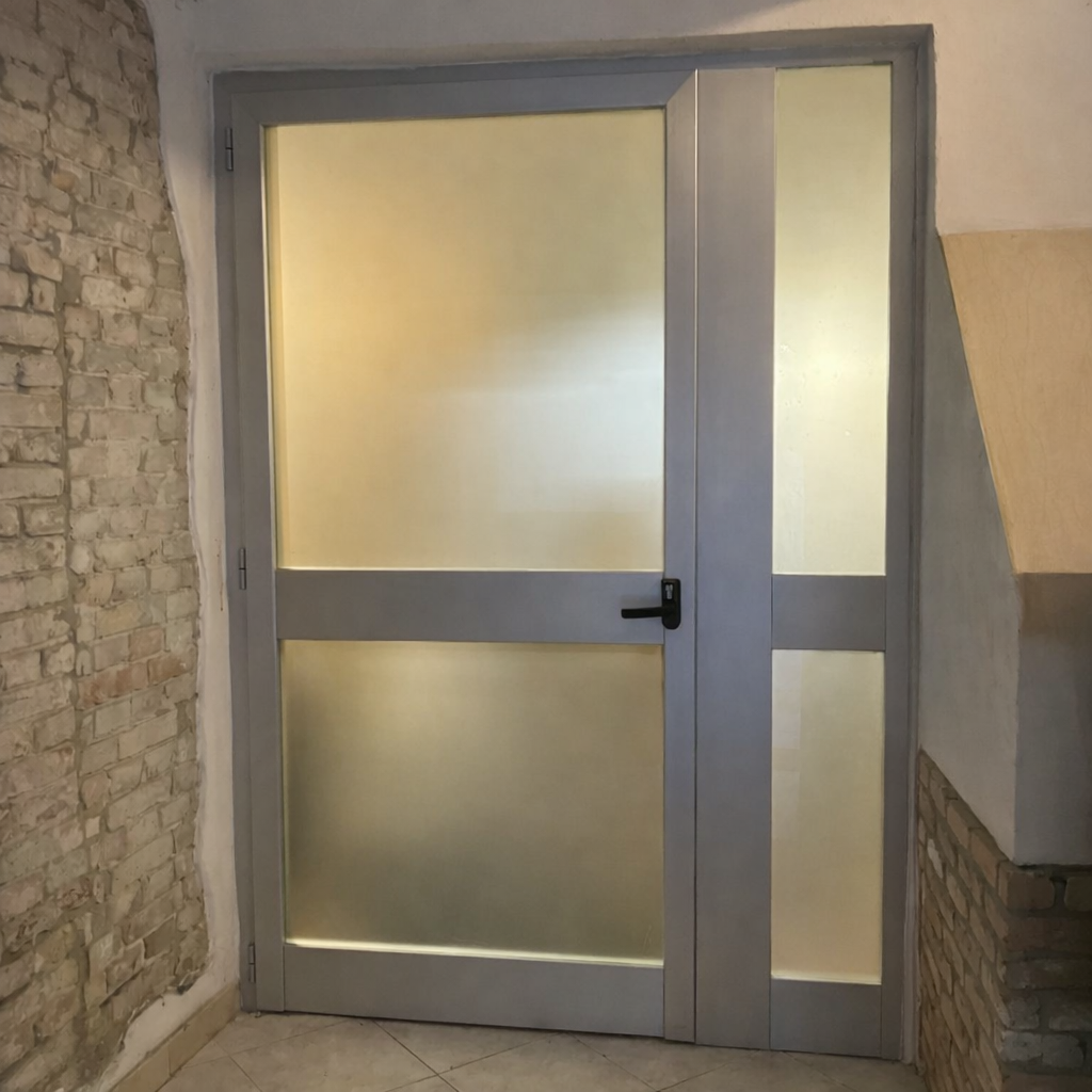 18. Porta a due ante asimmetrica, con apertura antipanico esterna. Colorazione Grigio Argento. Vetro Antifortunistico