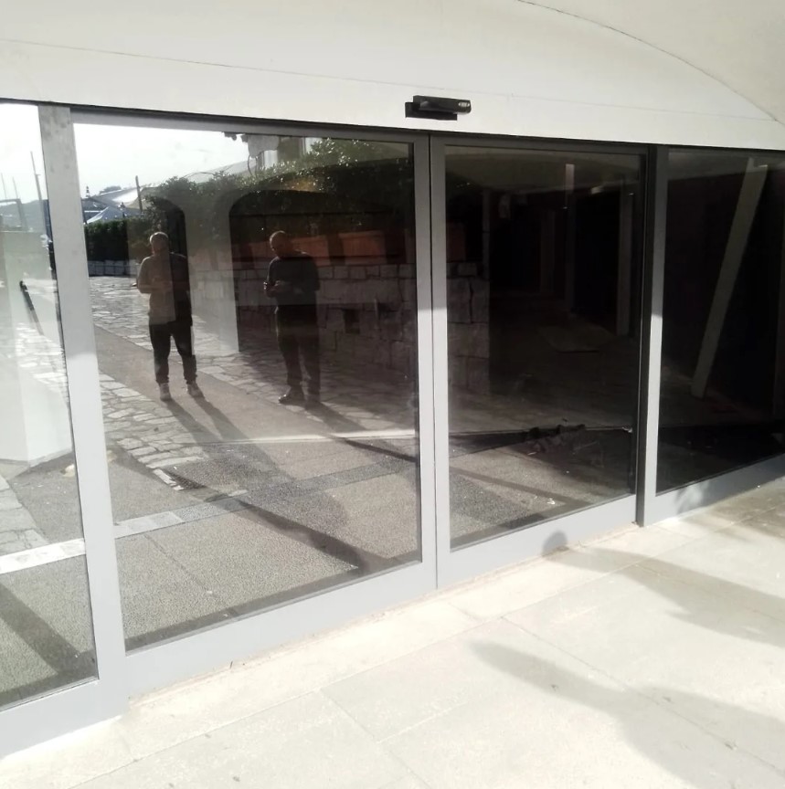 21. Porta a due ante scorrevole motorizzata, colore grigio argento, vetri camera antinfortunio